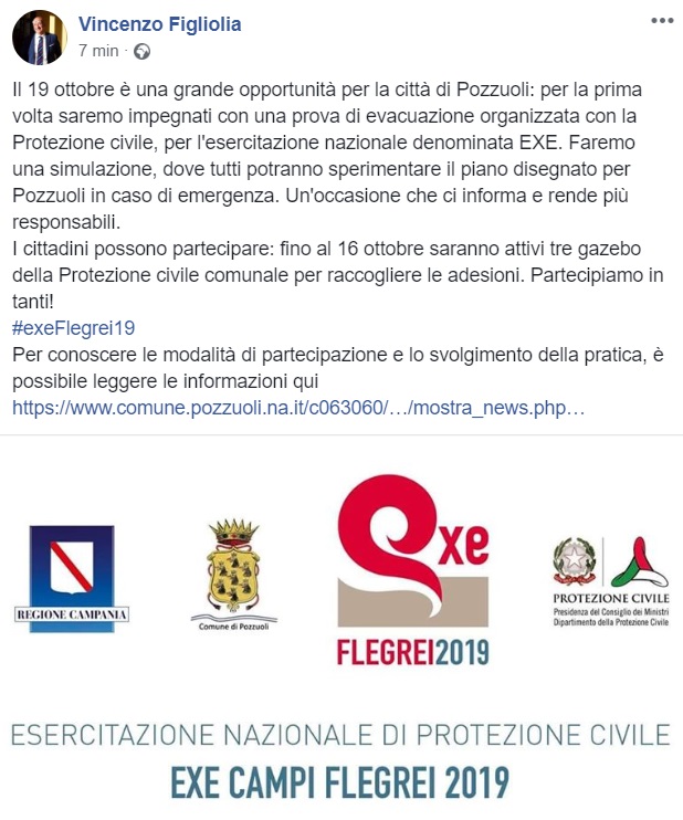 Questo quanto pubblicato sulla pagina Facebook del Sindaco di Pozzuoli, Vincenzo Figliolia: