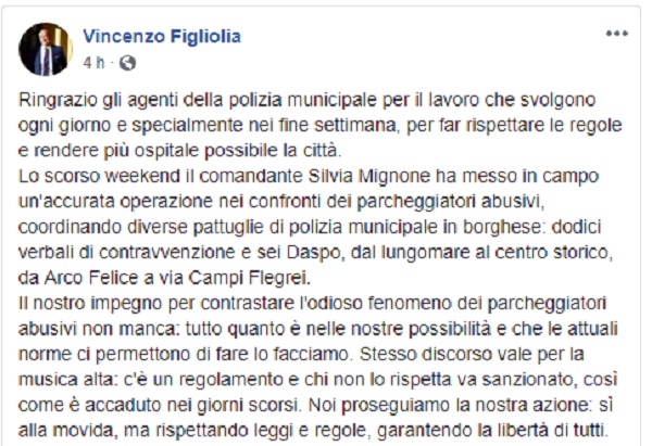 Questo il post pubblicato sulla pagina fb ufficiale del Sindaco di Pozzuoli Vincenzo Figliolia.