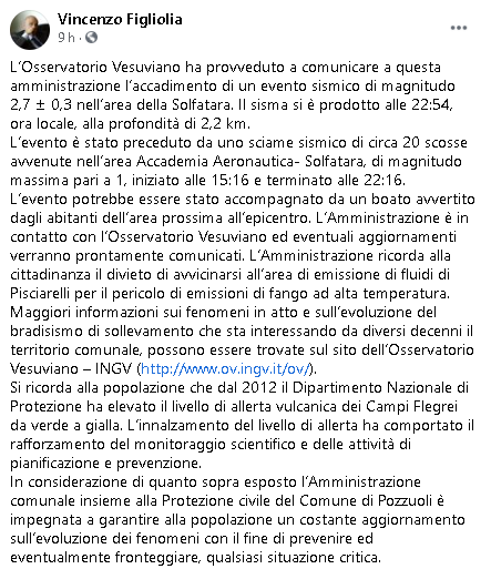 Lo apprendiamo dalla pagina Facebook del Sindaco di Pozzuoli, Vincenzo Figliolia.