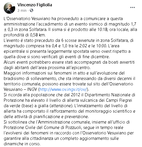 Lo apprendiamo dalla pagina Facebook del Sindaco di Pozzuoli, Vincenzo Figliolia.