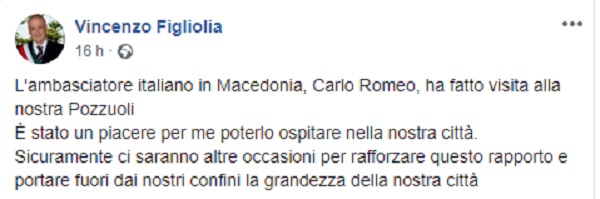 Questo il post pubblicato sulla pagina fb ufficiale del Sindaco di Pozzuoli Vincenzo Figliolia.