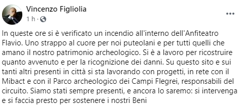 Questo il post pubblicato sulla sua pagina Facebook dal Sindaco di Pozzuoli Vincenzo Figliolia: "In queste ore si è verificato un incendio all'interno dell'Anfiteatro Flavio. Uno strappo al cuore per noi puteolani e per tutti quelli che amano il nostro patrimonio archeologico. Si è a lavoro per ricostruire quanto avvenuto - prosegue il Sindaco - e per la ricognizione dei danni. Su questo sito e sui tanti altri presenti in città si sta lavorando con progetti, in rete con il Mibact e con il Parco archeologico dei Campi Flegrei, responsabili del circuito. Siamo stati sempre presenti, e ancora lo saremo: si intervenga - conclude il Sindaco - e si faccia presto per sostenere i nostri Beni".