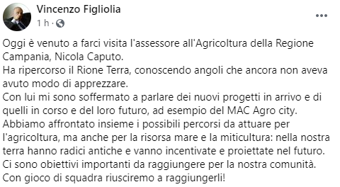 Questo il post pubblicato dal Sindaco di Pozzuoli Vincenzo Figliolia sulla sua pagina Facebook: "Oggi è venuto a farci visita l'assessore all'Agricoltura della Regione Campania, Nicola Caputo. Ha ripercorso il Rione Terra, conoscendo angoli che ancora non aveva avuto modo di apprezzare. Con lui mi - si legge nel post - sono soffermato a parlare dei nuovi progetti in arrivo e di quelli in corso e del loro futuro, ad esempio del MAC Agro city. Abbiamo affrontato insieme i possibili percorsi da attuare per l'agricoltura, ma anche per la risorsa mare e la miticultura: nella nostra terra hanno radici antiche e vanno incentivate e proiettate nel futuro. Ci sono obiettivi - conclude il post - importanti da raggiungere per la nostra comunità. Con gioco di squadra riusciremo a raggiungerli!".