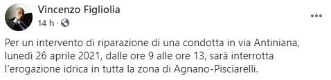 Questo il post pubblicato dal Sindaco di Pozzuoli Vincenzo Figliolia sulla sua pagina Facebook: "Per un intervento di riparazione di una condotta in via Antiniana - si legge nel post - lunedì 26 aprile 2021, dalle ore 9 alle ore 13, sarà interrotta l'erogazione idrica in tutta la zona di Agnano-Pisciarelli".