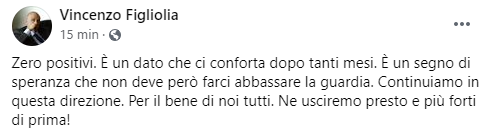 Questo il post pubblicato sulla sua pagina Facebook dal Sindaco di Pozzuoli Vincenzo Figliolia: "Zero positivi. È un dato che ci conforta dopo tanti mesi. È un segno di speranza - si legge nel post - che non deve però farci abbassare la guardia. Continuiamo in questa direzione. Per il bene di noi tutti. Ne usciremo presto e più forti di prima!".