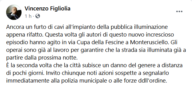 Questo il post pubblicato sulla pagina Facebook del sindaco di Pozzuoli Vinvenzo Figliolia. "Ancora un furto di cavi all'impianto della pubblica illuminazione appena rifatto. Questa volta gli autori di questo nuovo increscioso episodio hanno agito in via Cupa della Fescine a Monterusciello. Gli operai sono già al lavoro per garantire che la strada sia illuminata già a partire dalla prossima notte. È la seconda volta - si legge nel post - che la città subisce un danno del genere a distanza di pochi giorni. Invito chiunque noti azioni sospette a segnalarlo immediatamente alla polizia municipale o alle forze dell'ordine.
