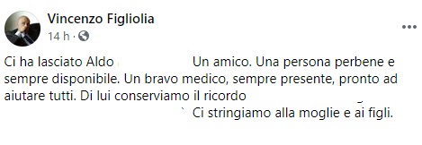 Questo parte del post pubblicato sulla sua pagina Facebook dal Sinadco di Pozzuoli Vincenzo Figliolia: "Ci ha lasciato Aldo (...). Un amico. Una persona perbene e sempre disponibile. Un bravo medico - si legge nel post - sempre presente, pronto ad aiutare tutti. Di lui conserviamo il ricordo (...). Ci stringiamo alla moglie e ai figli (...)".