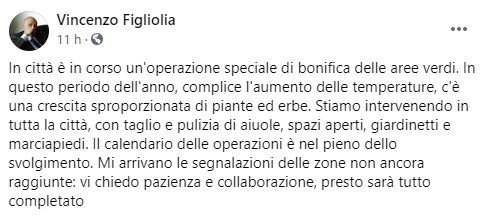 Questo il post pubblicato sulla sua pagina Facebook dal Sindaco di Pozzuoli Vincenzo Filgliolia: "In città è in corso un'operazione speciale di bonifica delle aree verdi. In questo periodo dell'anno, complice l'aumento delle temperature, c'è una crescita sproporzionata di piante ed erbe. Stiamo intervenendo - si legge nel post - in tutta la città, con taglio e pulizia di aiuole, spazi aperti, giardinetti e marciapiedi. Il calendario delle operazioni è nel pieno dello svolgimento. Mi arrivano le segnalazioni delle zone non ancora raggiunte: vi chiedo - prosegue il post - pazienza e collaborazione, presto sarà tutto completato".
