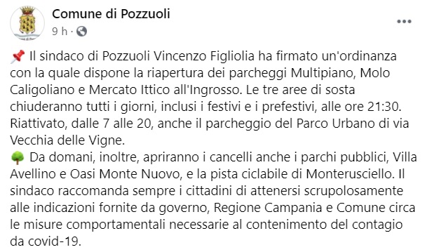 "Il sindaco di Pozzuoli Vincenzo Figliolia ha firmato un'ordinanza con la quale dispone la riapertura dei parcheggi Multipiano, Molo Caligoliano e Mercato Ittico all'Ingrosso. Le tre aree di sosta chiuderanno tutti i giorni, inclusi i festivi e i prefestivi, alle ore 21:30. Riattivato, dalle 7 alle 20, anche il parcheggio del Parco Urbano di via Vecchia delle Vigne. -Si legge nella nota- Da domani, inoltre, apriranno i cancelli anche i parchi pubblici, Villa Avellino e Oasi Monte Nuovo, e la pista ciclabile di Monterusciello. Il sindaco raccomanda sempre i cittadini di attenersi scrupolosamente alle indicazioni fornite da governo, Regione Campania e Comune circa le misure comportamentali necessarie al contenimento del contagio da covid-19."