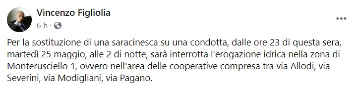 Questo quanto apprendiamo dalla pagina fb del Sindaco di Pozzuoli: "Per la sostituzione di una saracinesca su una condotta, dalle ore 23 di questa sera, martedì 25 maggio, alle 2 di notte, sarà interrotta l'erogazione idrica nella zona di Monterusciello 1, ovvero nell'area delle cooperative compresa tra via Allodi, via Severini, via Modigliani, via Pagano."
