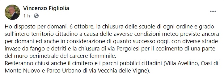 Questo quanto apprendiamo dalla pagina fb del Sindaco Figliolia: "Ho disposto per domani%u200B, 6 ottobre, la chiusura delle scuole di ogni ordine e grado sull'intero territorio cittadino a causa delle avverse condizioni meteo previste ancora per domani ed anche in considerazione di quanto successo oggi, con diverse strade invase da fango e detriti e la chiusura di via Pergolesi per il cedimento di una parte del muro perimetrale del carcere femminile. Resteranno chiusi anche il cimitero e i parchi pubblici cittadini (Villa Avellino, Oasi di Monte Nuovo e Parco Urbano di via Vecchia delle Vigne)."
