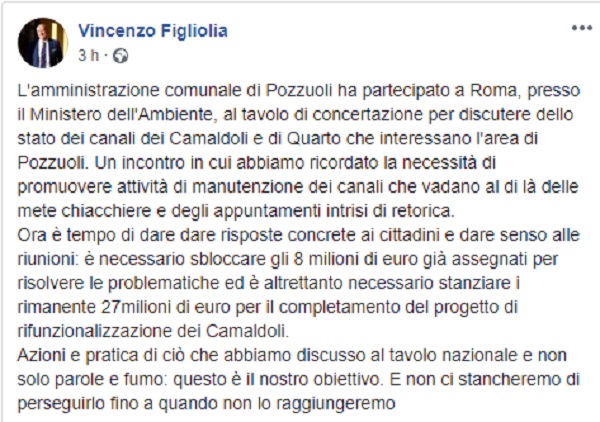 Questo il post pubblicato sulla pagina fb ufficiale del Sindaco di Pozzuoli Vincenzo Figliolia.