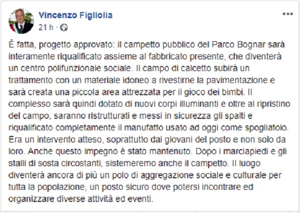 Questo il post pubblicato sulla pagina fb del Sindaco di Pozzuoli Vincenzo Figliolia