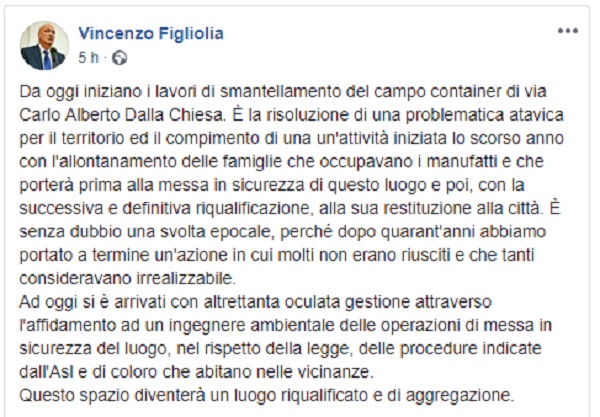 Questo il post pubblicato sulla pagina fb ufficiale del Sindaco di Pozzuoli Vincenzo Figliolia.