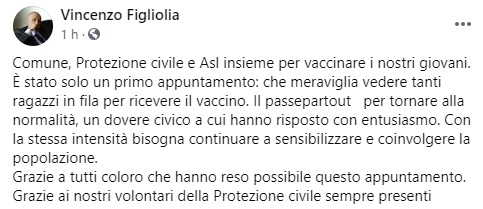 Questo il post pubblicato sulla sua pagina Facebook dal Sindaco di Pozzuoli Vincenzo Figliolia: "Comune, Protezione civile e Asl insieme per vaccinare i nostri giovani. È stato solo - si legge nel post - un primo appuntamento: che meraviglia vedere tanti ragazzi in fila per ricevere il vaccino. Il passepartout per tornare alla normalità, un dovere civico a cui hanno risposto con entusiasmo. Con la stessa intensità bisogna continuare a sensibilizzare e coinvolgere la popolazione. Grazie a tutti - conclude il Sindaco - coloro che hanno reso possibile questo appuntamento. Grazie ai nostri volontari della Protezione civile sempre presenti".