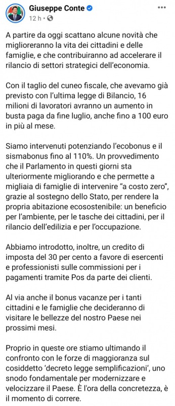 "A partire da oggi scattano alcune novità che miglioreranno la vita dei cittadini e delle famiglie, e che contribuiranno ad accelerare il rilancio di settori strategici dell’economia. Con il taglio del cuneo fiscale, che avevamo già previsto con l’ultima legge di Bilancio, 16 milioni di lavoratori avranno un aumento in busta paga da fine luglio, anche fino a 100 euro in più al mese. Siamo intervenuti potenziando l’ecobonus e il sismabonus fino al 110%. Un provvedimento che il Parlamento in questi giorni sta ulteriormente migliorando e che permette a migliaia di famiglie di intervenire “a costo zero”, grazie al sostegno dello Stato, per rendere la propria abitazione ecosostenibile: un beneficio per l’ambiente, per le tasche dei cittadini, per il rilancio dell’edilizia e per l’occupazione. Abbiamo introdotto, inoltre, un credito di imposta del 30 per cento a favore di esercenti e professionisti sulle commissioni per i pagamenti tramite Pos da parte dei clienti. Al via anche il bonus vacanze per i tanti cittadini e le famiglie che decideranno di visitare le bellezze del nostro Paese nei prossimi mesi. Proprio in queste ore stiamo ultimando il confronto con le forze di maggioranza sul cosiddetto ‘decreto legge semplificazioni‘, uno snodo fondamentale per modernizzare e velocizzare il Paese. È l'ora della concretezza, è il momento di correre."