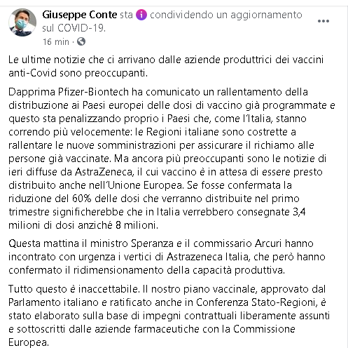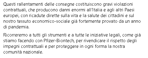 "Le ultime notizie che ci arrivano dalle aziende produttrici dei vaccini anti-Covid sono preoccupanti. Dapprima Pfizer-Biontech ha comunicato un rallentamento della distribuzione ai Paesi europei delle dosi di vaccino già programmate e questo sta penalizzando proprio i Paesi che, come l’Italia, stanno correndo più velocemente: le Regioni italiane sono costrette a rallentare le nuove somministrazioni per assicurare il richiamo alle persone già vaccinate. Ma ancora più preoccupanti sono le notizie di ieri diffuse da AstraZeneca, il cui vaccino è in attesa di essere presto distribuito anche nell’Unione Europea. Se fosse confermata la riduzione del 60% delle dosi che verranno distribuite nel primo trimestre significherebbe che in Italia verrebbero consegnate 3,4 milioni di dosi anziché 8 milioni. Questa mattina il ministro Speranza e il commissario Arcuri hanno incontrato con urgenza i vertici di Astrazeneca Italia, che però hanno confermato il ridimensionamento della capacità produttiva. Tutto questo è inaccettabile. Il nostro piano vaccinale, approvato dal Parlamento italiano e ratificato anche in Conferenza Stato-Regioni, è stato elaborato sulla base di impegni contrattuali liberamente assunti e sottoscritti dalle aziende farmaceutiche con la Commissione Europea. Questi rallentamenti delle consegne costituiscono gravi violazioni contrattuali, che producono danni enormi all’Italia e agli altri Paesi europei, con ricadute dirette sulla vita e la salute dei cittadini e sul nostro tessuto economico-sociale già fortemente provato da un anno di pandemia. Ricorreremo a tutti gli strumenti e a tutte le iniziative legali, come già stiamo facendo con Pfizer-Biontech, per rivendicare il rispetto degli impegni contrattuali e per proteggere in ogni forma la nostra comunità nazionale."