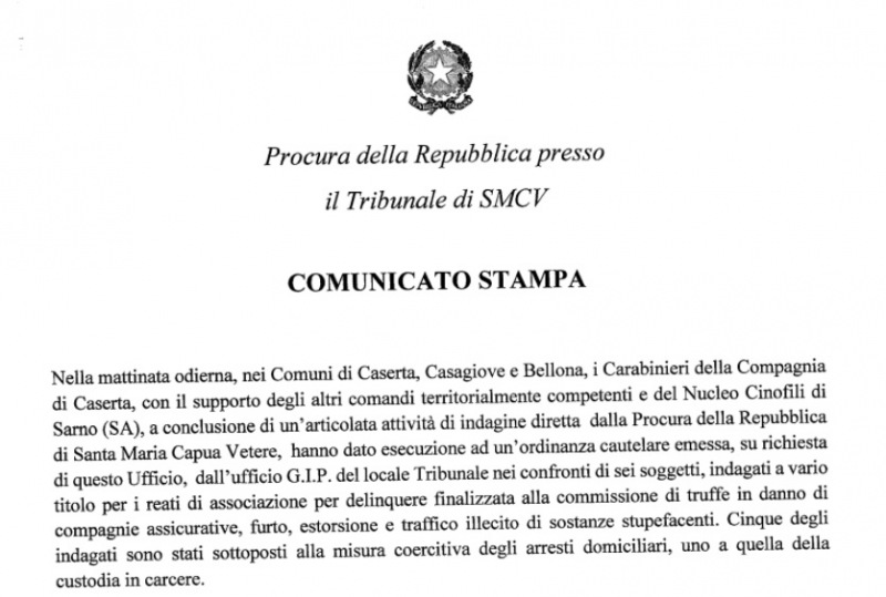 Ce, Bellona, Casagiove. "Associazione per delinquere finalizzata alla commissione di truffe in danno di compagnie assicurative"