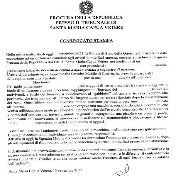 Procura SMCV. "Ritenuto gravemente indiziato dei reati di rapina a mano armata e sequestro di persona", un uomo nei guai