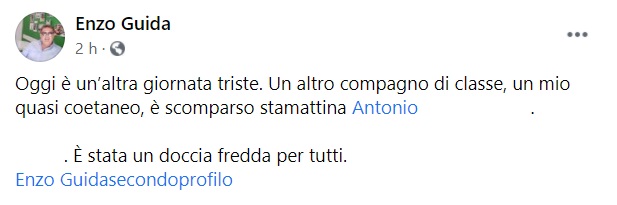 "Oggi è un’altra giornata triste. Un altro compagno di classe, un mio quasi coetaneo, è scomparso stamattina Antonio ... -Si legge nella nota- È stata un doccia fredda per tutti."