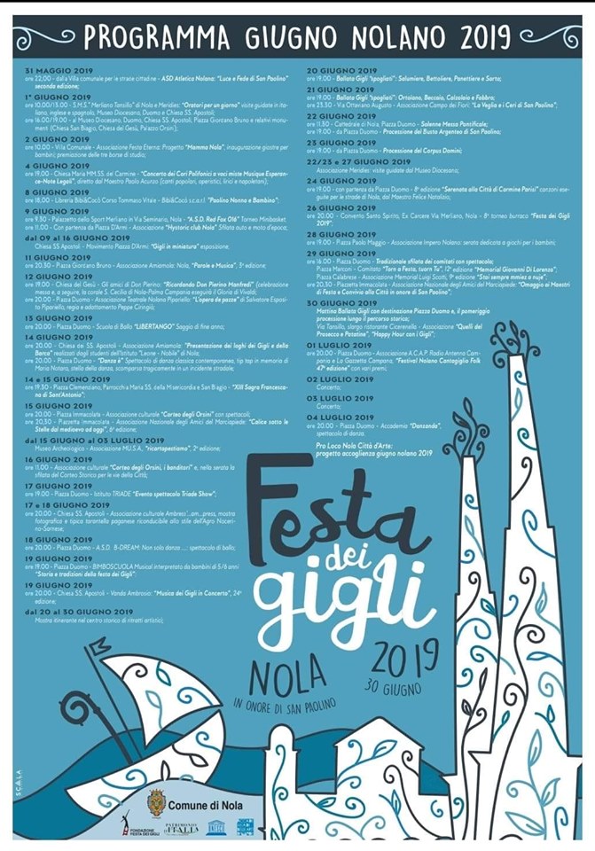 "Ecco il programma del Giugno Nolano redatto dalla Fondazione Festa dei Gigli a cui è stata affidata l'organizzazione degli eventi.