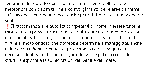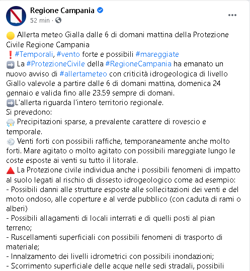 "Allerta meteo Gialla dalle 6 di domani mattina della Protezione Civile Regione Campania. Temporali, vento forte e possibili mareggiate. La Protezione Civile della Regione Campania ha emanato un nuovo avviso di allerta meteo con criticità idrogeologica di livello Giallo valevole a partire dalle 6 di domani mattina, domenica 24 gennaio e valida fino alle 23.59 sempre di domani. L'allerta riguarda l'intero territorio regionale. Si prevedono: Precipitazioni sparse, a prevalente carattere di rovescio e temporale. Venti forti con possibili raffiche, temporaneamente anche molto forti. Mare agitato o molto agitato con possibili mareggiate lungo le coste esposte ai venti su tutto il litorale. La Protezione civile individua anche i possibili fenomeni di impatto al suolo legati al rischio di dissesto idrogeologico come ad esempio: - Possibili danni alle strutture esposte alle sollecitazioni dei venti e del moto ondoso, alle coperture e al verde pubblico (con caduta di rami o alberi) - Possibili allagamenti di locali interrati e di quelli posti al pian terreno; - Ruscellamenti superficiali con possibili fenomeni di trasporto di materiale; - Innalzamento dei livelli idrometrici con possibili inondazioni; - Scorrimento superficiale delle acque nelle sedi stradali, possibili fenomeni di rigurgito dei sistemi di smaltimento delle acque meteoriche con tracimazione e coinvolgimento delle aree depresse; - Occasionali fenomeni franosi anche per effetto della saturazione dei suoli. Si raccomanda alle autorità competenti di porre in essere tutte le misure atte a prevenire, mitigare e contrastare i fenomeni previsti sia in odine al rischio idrogeologico che in ordine ai venti forti o molto forti e al moto ondoso che potrebbe determinare mareggiate, anche in linea con i Piani comunali di protezione civile. Si segnala la necessità di attivare il monitoraggio del verde pubblico e delle strutture esposte alle sollecitazioni dei venti e del mare."