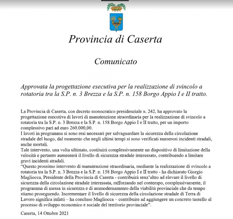"Approvata la progettazione esecutiva per la realizzazione di svincolo a rotatoria tra la S.P. n. 3 Brezza e la S.P. n. 158 Borgo Appio I e II tratto. La Provincia di Caserta, con decreto monocratico presidenziale n. 242, ha approvato la progettazione esecutiva di lavori di manutenzione straordinaria per la realizzazione- si legge nella nota- di svincolo a rotatoria tra la S.P. n. 3 Brezza e la S.P. n. 158 Borgo Appio I e II tratto, per un importo complessivo pari ad euro 260.000,00. I lavori in programma si sono resi necessari per salvaguardare la sicurezza della circolazione stradale del luogo, dal momento che negli ultimi tempi si sono verificati numerosi incidenti stradali, anche mortali. Tale intervento, una volta ultimato, costituirà complessivamente un dispositivo di limitazione della velocità e pertanto aumenterà il livello di sicurezza stradale interessato, contribuendo a limitare gravi incidenti stradali. “Questo prossimo intervento di manutenzione straordinaria, mediante la realizzazione di svincolo a rotatoria tra la S.P. n. 3 Brezza e la S.P. n. 158 Borgo Appio I e II tratto - ha dichiarato Giorgio Magliocca, Presidente della Provincia di Caserta - contribuirà senz’altro ad elevare il livello di sicurezza della circolazione stradale interessata, rafforzando nel contempo, complessivamente, il programma di messa in sicurezza e di ammodernamento della viabilità provinciale che da tempo- si legge nella nota- stiamo proseguendo. Incrementare il livello di sicurezza della circolazione stradale di Terra di Lavoro significa infatti – ha concluso Magliocca – contribuire ad aggiungere un concreto tassello al processo di sviluppo economico e sociale del territorio provinciale”."
