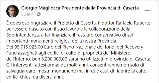 Questo quanto pubblicato sulla pagina fb Pres. Provincia Ce Magliocca: "È doveroso ringraziare il Prefetto di Caserta, il dottor Raffaele Ruberto, per essere riuscito con il suo lavoro e la collaborazione della Soprintendenza - si legge nella nota -, a far finanziare il restauro conservativo di sei importanti monumenti religiosi della nostra Provincia. Dei 95.715.925,00 Euro del Piano Nazionale dei fondi del Recovery Fund assegnati agli edifici di culto di proprietà del Ministero dell'Interno, ben 5.200.000,00 saranno utilizzati in provincia di Caserta. Gli interventi, attesi ormai da molti anni - si legge nella nota -, consentiranno non solo di salvaguardare i nostri monumenti ma, in due casi, di riaprire al culto edifici chiusi da diversi anni."