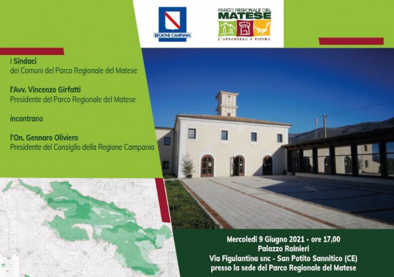 Mercoledì 9 giugno 2021, alle ore 17, al Palazzo Ranieri, i Sindaci del Parco Regionale del Matese incontreranno il Presidente del Cons. Reg. della Campania, Gennaro Oliviero