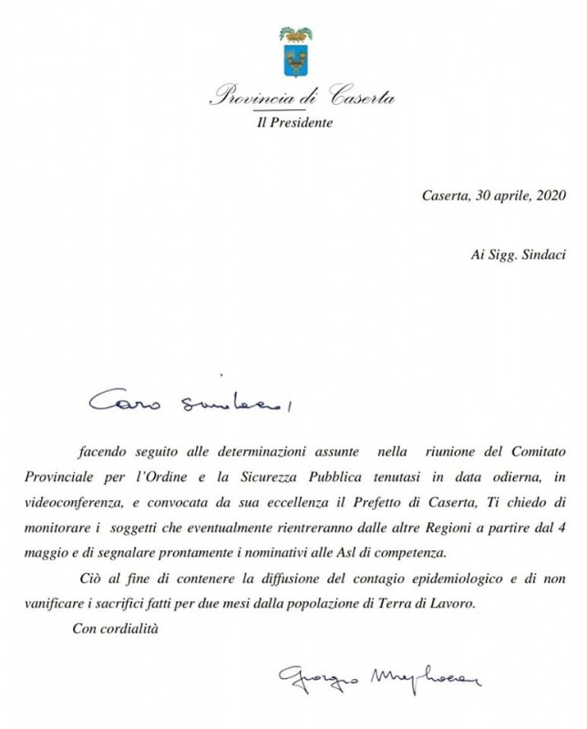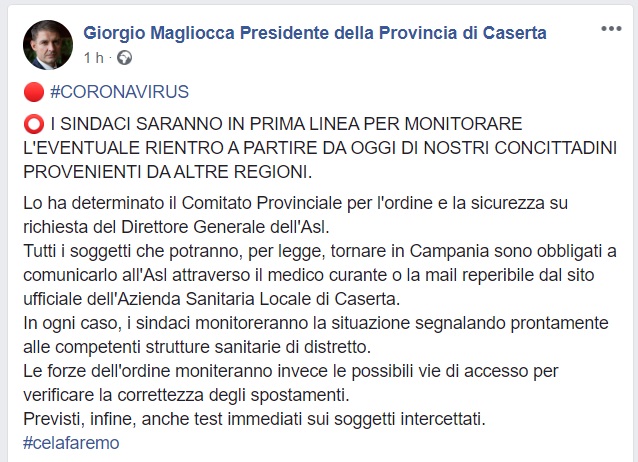 Questo quanto comunicato dal Presidente Prov. CE Magliocca