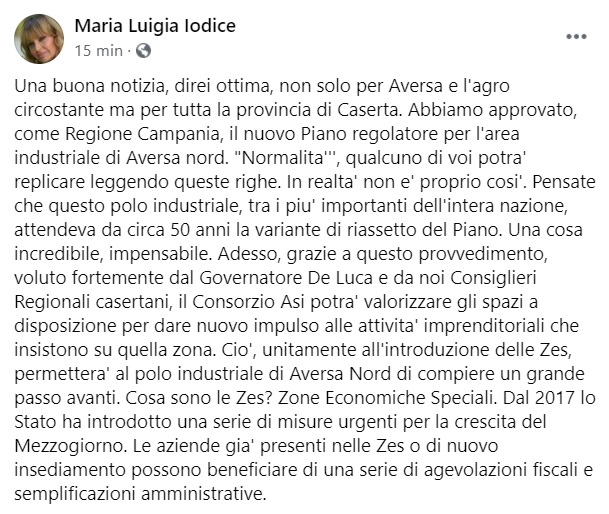 "Una buona notizia, direi ottima, non solo per Aversa e l'agro circostante ma per tutta la provincia di Caserta. Abbiamo approvato, come Regione Campania, il nuovo Piano regolatore per l'area industriale di Aversa nord. "Normalita''', qualcuno di voi potra' replicare leggendo queste righe. In realta'- si legge nella nota- non e' proprio cosi'. Pensate che questo polo industriale, tra i piu' importanti dell'intera nazione, attendeva da circa 50 anni la variante di riassetto del Piano. Una cosa incredibile, impensabile. Adesso, grazie a questo provvedimento, voluto fortemente dal Governatore De Luca e da noi Consiglieri Regionali casertani, il Consorzio Asi potra' valorizzare gli spazi a disposizione per dare nuovo impulso alle attivita' imprenditoriali che insistono su quella zona. Cio', unitamente all'introduzione delle Zes, permettera' al polo industriale di Aversa Nord di compiere un grande passo avanti. Cosa sono le Zes? Zone Economiche Speciali. Dal 2017 lo Stato ha introdotto- si legge nella nota- una serie di misure urgenti per la crescita del Mezzogiorno. Le aziende gia' presenti nelle Zes o di nuovo insediamento possono beneficiare di una serie di agevolazioni fiscali e semplificazioni amministrative."