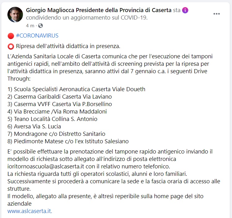 Questo quanto pubblicato sulla pagina fb del Pres. Provincia di Caserta Magliocca