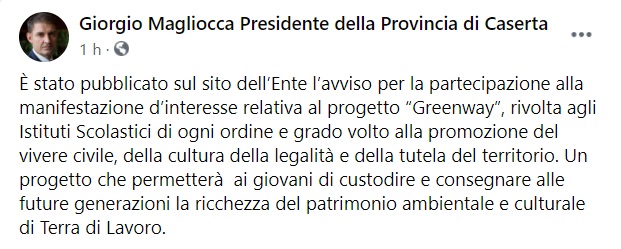 "È stato pubblicato sul sito dell’Ente l’avviso per la partecipazione alla manifestazione d’interesse relativa al progetto “Greenway”, rivolta agli Istituti Scolastici di ogni ordine e grado volto alla promozione del vivere civile, della cultura della legalità e della tutela del territorio. Un progetto che permetterà ai giovani di custodire e consegnare alle future generazioni la ricchezza del patrimonio ambientale e culturale di Terra di Lavoro."