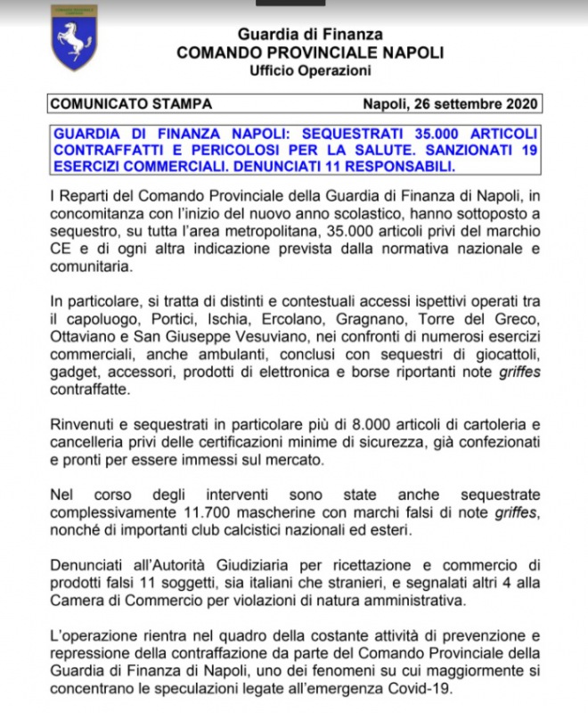 Questa la nota della Guardia di Finanza di Napoli: