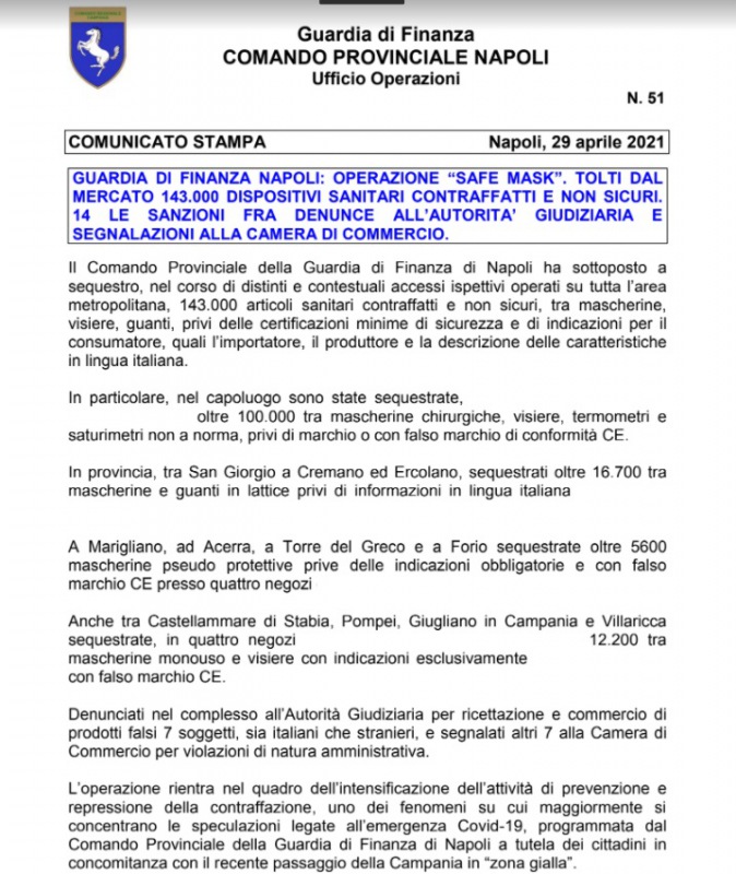 Na, S. Giorgio a C., Marigliano e Giugliano. "Tolti dal mercato 143.000 dispositivi sanitari contraffatti e non sicuri"