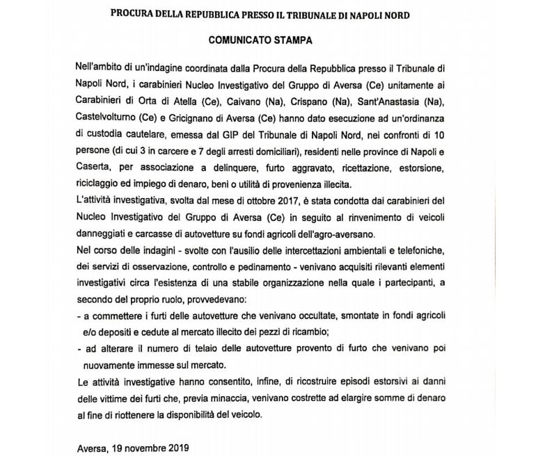Di seguito, il testo del comunicato della Procura della Repubblica presso il Tribunale di Napoli Nord, inviatoci dal Comando Provinciale dei Carabinieri di Caserta.