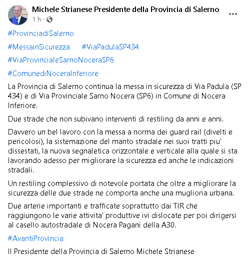 "La Provincia di Salerno continua la messa in sicurezza di Via Padula (SP 434) e di Via Provinciale Sarno Nocera (SP6) in Comune di Nocera Inferiore. Due strade che non subivano interventi di restiling da anni e anni. Davvero un bel lavoro con la messa a norma dei guard rail (divelti e pericolosi), la sistemazione del manto stradale nei suoi tratti piu' dissestati, la nuova segnaletica orizzontale e verticale alla quale si sta lavorando adesso per migliorare la sicurezza ed anche le indicazioni stradali. Un restiling complessivo di notevole portata che oltre a migliorare la sicurezza delle due strade ne comporta anche una muglioria urbana. Due arterie importanti e trafficate soprattutto dai TIR che raggiungono le varie attivita' produttive ivi dislocate per poi dirigersi al casello autostradale di Nocera Pagani della A30."