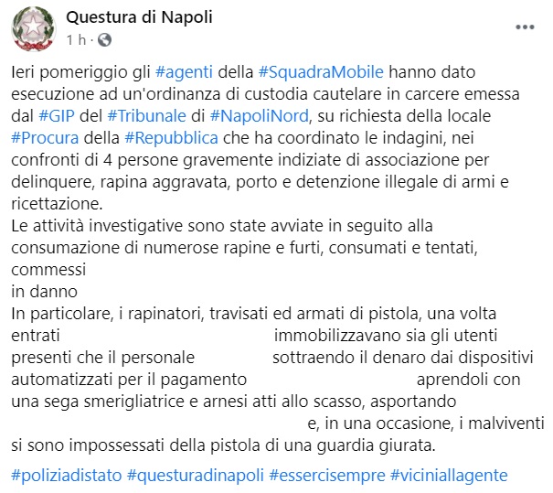 Questo parte del post diffuso dalla Pagina Facebook della Questura di Napoli :"Ieri pomeriggio gli agenti della Squadra Mobile hanno dato esecuzione ad un'ordinanza di custodia cautelare in carcere emessa dal GIP del Tribunale di Napoli Nord, su richiesta della locale Procura della Repubblica che ha coordinato le indagini, nei confronti di 4 persone gravemente indiziate di associazione per delinquere, rapina aggravata, porto e detenzione illegale di armi e ricettazione. Le attività investigative - prosegue il post - sono state avviate in seguito alla consumazione di numerose rapine e furti, consumati e tentati, commessi (...) in danno ... In particolare, i rapinatori, travisati ed armati di pistola, una volta entrati all'interno ... immobilizzavano sia gli utenti presenti che il personale ... sottraendo - conclude il post - il denaro dai dispositivi automatizzati per il pagamento ... aprendoli con una sega smerigliatrice e arnesi atti allo scasso, asportando (...) e, in una occasione, i malviventi si sono impossessati della pistola di una guardia giurata.