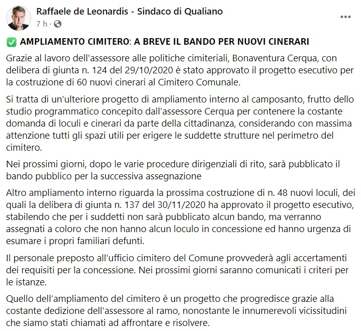 "AMPLIAMENTO CIMITERO: A BREVE IL BANDO PER NUOVI CINERARI. Grazie al lavoro dell'assessore alle politiche cimiteriali, Bonaventura Cerqua, con delibera di giunta n. 124 del 29/10/2020 è stato approvato il progetto esecutivo per la costruzione di 60 nuovi cinerari- si legge nella nota- al Cimitero Comunale. Si tratta di un'ulteriore progetto di ampliamento interno al camposanto, frutto dello studio programmatico concepito dall'assessore Cerqua per contenere la costante domanda di loculi e cinerari da parte della cittadinanza, considerando con massima attenzione tutti gli spazi utili per erigere le suddette strutture nel perimetro del cimitero. Nei prossimi giorni, dopo le varie procedure dirigenziali di rito, sarà pubblicato il bando pubblico per la successiva assegnazione Altro ampliamento interno riguarda la prossima costruzione di n. 48 nuovi loculi, dei quali la delibera di giunta n. 137 del 30/11/2020 ha approvato il progetto esecutivo, stabilendo che per i suddetti non sarà pubblicato alcun bando, ma verranno assegnati a coloro che non hanno alcun loculo in concessione ed hanno urgenza di esumare i propri familiari defunti. Il personale preposto all'ufficio cimitero del Comune provvederà agli accertamenti dei requisiti per la concessione. Nei prossimi giorni saranno comunicati i criteri per le istanze. Quello dell’ampliamento del cimitero- si legge nella nota- è un progetto che progredisce grazie alla costante dedizione dell'assessore al ramo, nonostante le innumerevoli vicissitudini che siamo stati chiamati ad affrontare e risolvere."