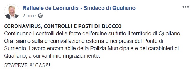 Questo quanto pubblicato uslla pagina facebook del Sindaco de Leonardis: