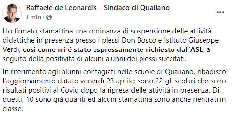 Questa parte del post pubblicato sulla sua pagina Facebook dal Sindaco di Qualiano Raffaele De Leonardis: "Ho firmato stamattina una ordinanza di sospensione delle attività didattiche in presenza presso i plessi Don Bosco e Istituto Giuseppe Verdi, così come mi è stato espressamente richiesto dall'Asl,a seguito della positività di alcuni alunni dei plessi succitati. In riferimento - si legge nel post - agli alunni contagiati nelle scuole di Qualiano, ribadisco l'aggiornamento datato venerdì 23 aprile: sono 22 gli scolari che sono risultati positivi al Covid dopo la ripresa delle attività in presenza. Di questi, 10 sono già guariti - conclude il post - ed alcuni stamattina sono anche rientrati in classe (...)".
