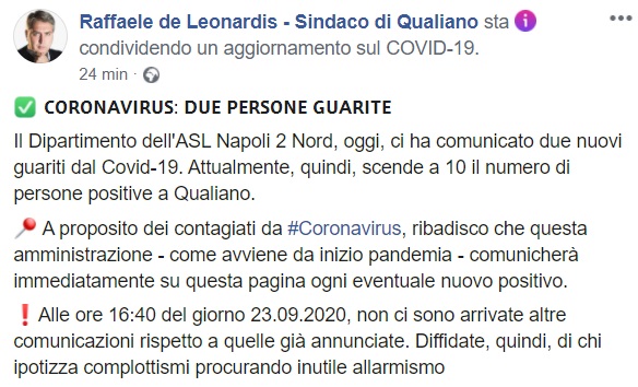 Qualiano. de Leonardis: "Due nuovi guariti dal Covid-19. Scende a 10 il numero di persone positive"