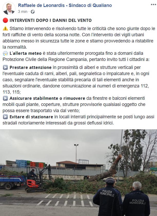 Questo quanto appreso dalla pagina Facebook del Sindaco De Leonardis: