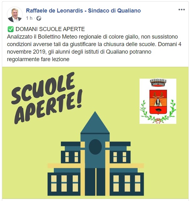 Questo quanto comunicato dal Sindaco De Leonardis sulla propria pagina FB