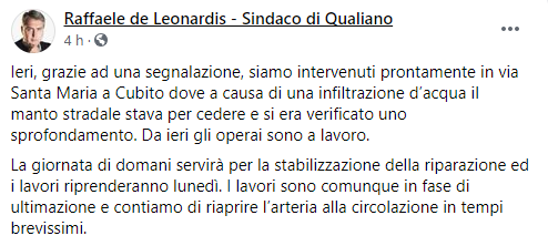Questo il post pubblicato sulla sua pagina Facebook dal Sindaco di Qualiano Raffaele De Leonardis: "Ieri, grazie ad una segnalazione, siamo intervenuti prontamente in via Santa Maria a Cubito dove a causa di una infiltrazione d’acqua - si legge nel post - il manto stradale stava per cedere e si era verificato uno sprofondamento. Da ieri gli operai sono a lavoro. La giornata di domani servirà per la stabilizzazione della riparazione ed i lavori riprenderanno lunedì. I lavori - prosegue il post - sono comunque in fase di ultimazione e contiamo di riaprire l’arteria alla circolazione in tempi brevissimi".
