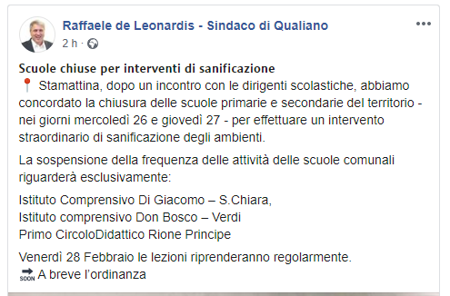 "Scuole chiuse per interventi di sanificazione. Stamattina, dopo un incontro con le Dirigenti scolastiche, abbiamo concordato la chiusura delle scuole primarie e secondarie del territorio - nei giorni mercoledì 26 e giovedì 27 - per effettuare un intervento straordinario di sanificazione degli ambienti.
