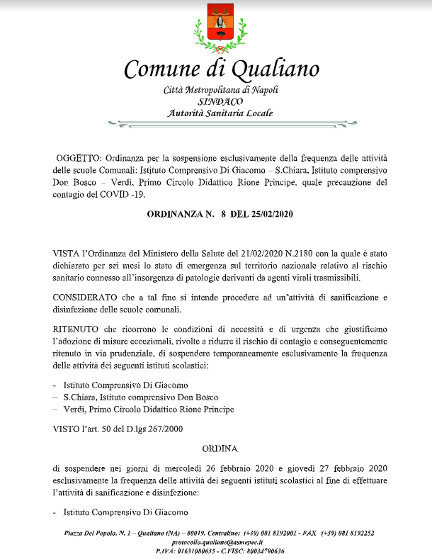 Lo apprendiamo dalla pagina Facebook del Sindaco di Qualiano, Raffaele de Leonardis:
