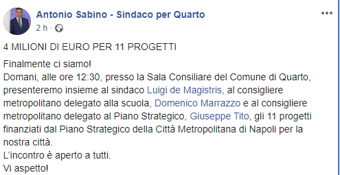 Domani, alle ore 12:30, presso la Sala Consiliare del Comune di Quarto, presenteremo insieme al sindaco Luigi de Magistris, al consigliere metropolitano delegato alla scuola, Domenico Marrazzo e al consigliere metropolitano delegato al Piano Strategico, Giuseppe Tito, gli 11 progetti finanziati dal Piano Strategico della Città Metropolitana di Napoli per la nostra città. L’incontro è aperto a tutti.