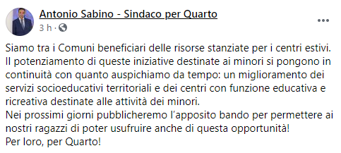 Questo il post pubblicato sulla sua pagina Facebook dal Sindaco di Quarto Antonio Sabino: "Siamo tra i Comuni beneficiari delle risorse stanziate per i centri estivi. Il potenziamento di queste iniziative destinate ai minori si pongono in continuità con quanto auspichiamo da tempo: un miglioramento - si legge nel post - dei servizi socioeducativi territoriali e dei centri con funzione educativa e ricreativa destinate alle attività dei minori. Nei prossimi giorni - conclude il post - pubblicheremo l’apposito bando per permettere ai nostri ragazzi di poter usufruire anche di questa opportunità! Per loro, per Quarto!".
