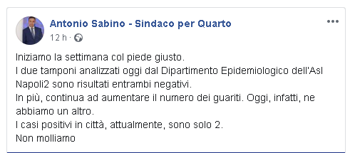 Lo apprendiamo dalla pagina Facebook di Antonio Sabino, Sindaco di Quarto: